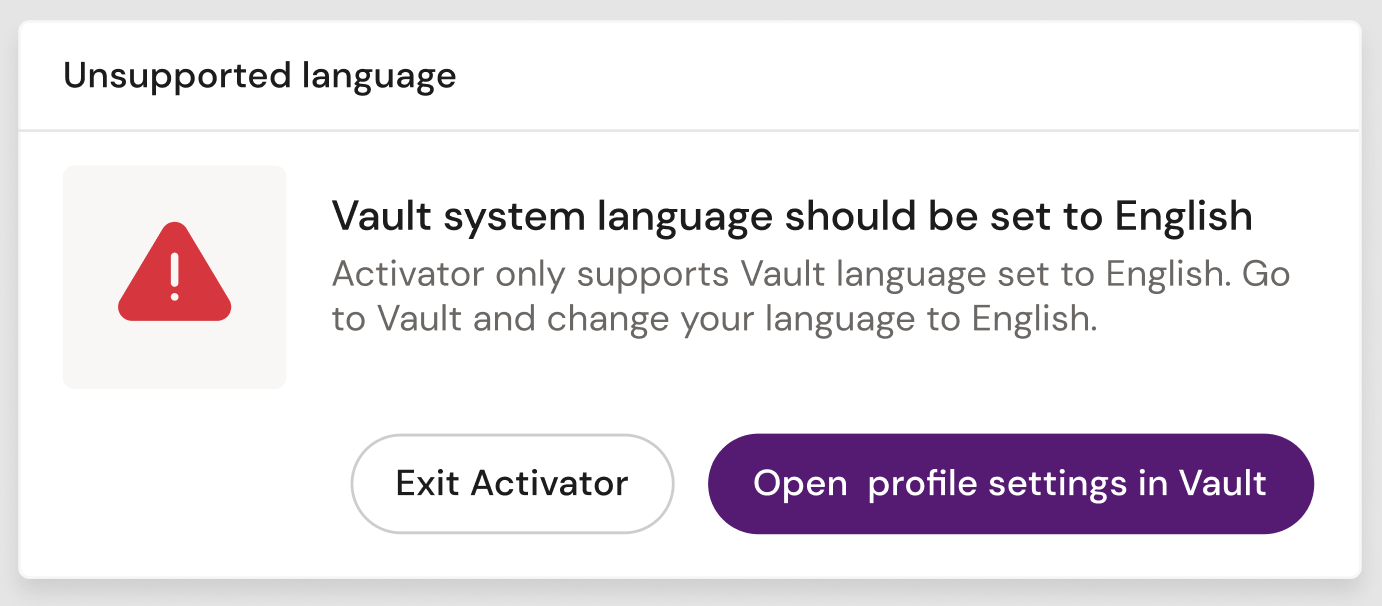 Activator currently only supports English language settings in Veeva Vault PromoMats account profiles.
