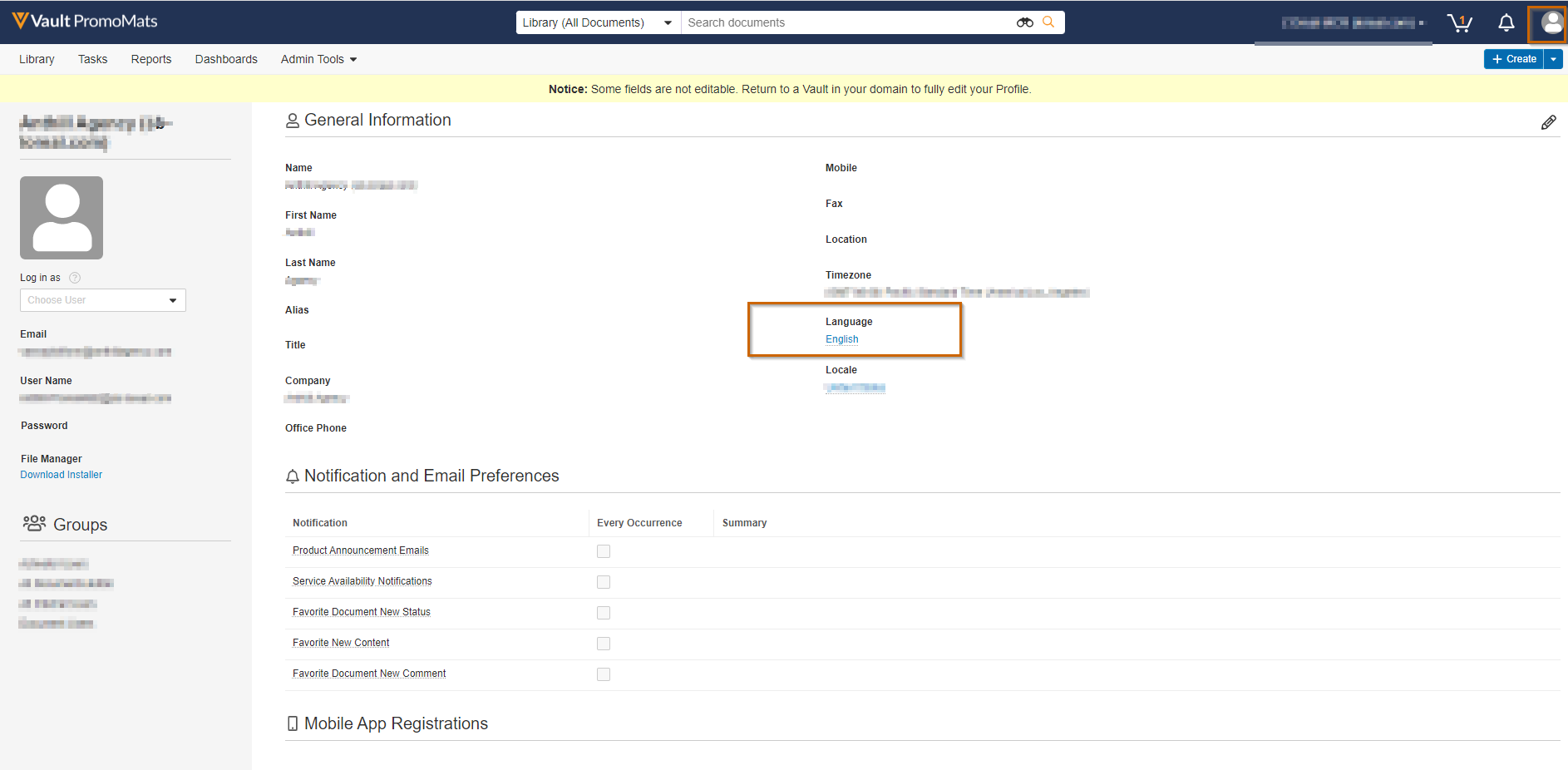 If the user profile is configured to use another language in Veeva Vault Promomats, a popup will show when the user logs in. The popup notifies the user and prompts the user to change the language setting to English.