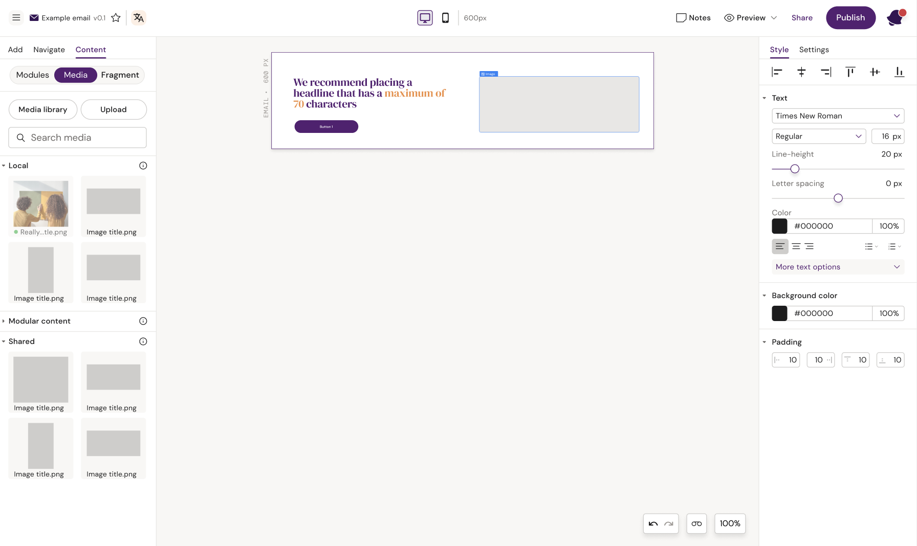 To add an image into the image container, the user must open the content panel on the left, select media, and drag in an image from the panel. Local and shared images will by default be shown in the panel, but the user can also import images from vault through the Media library or upload images from their computer as local, shared or vault assets.