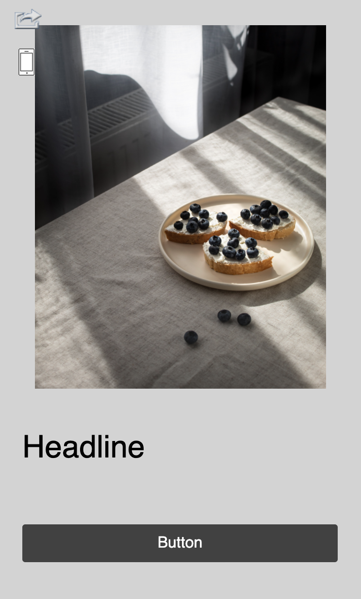 The button component is a simple element that can be styled in multiple ways. The user can click directly on the button text to edit the text. A link can be added to the button by clicking the link icon next to the button tag or opening the button settings in the right panel.