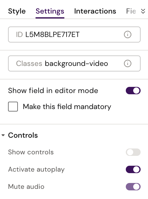Note: in 2.1.2 and below, there is a bug that show the video controls even if the toggle is ‘false’ from the beginning. To remove the controls, toggle the ‘Show controls’ back and forth (so it ends at ‘false’ again).