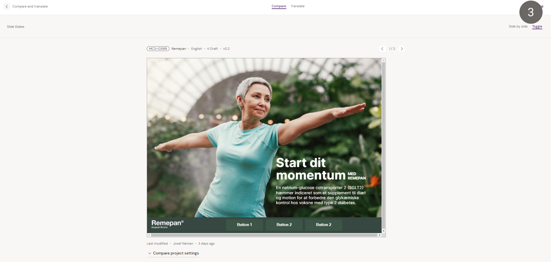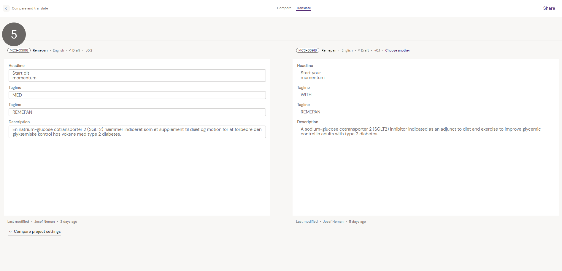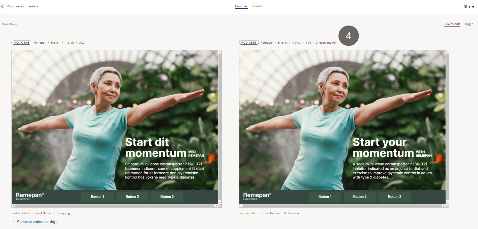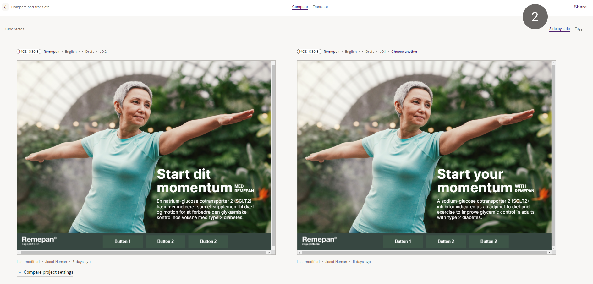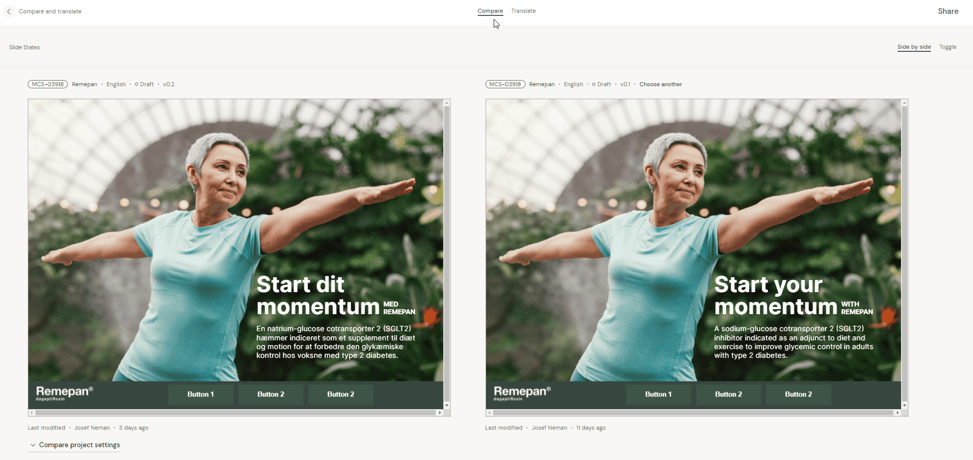 Compare and Translate allows you to view two versions of a Slide, Email or Brief at the same time for visual comparison.