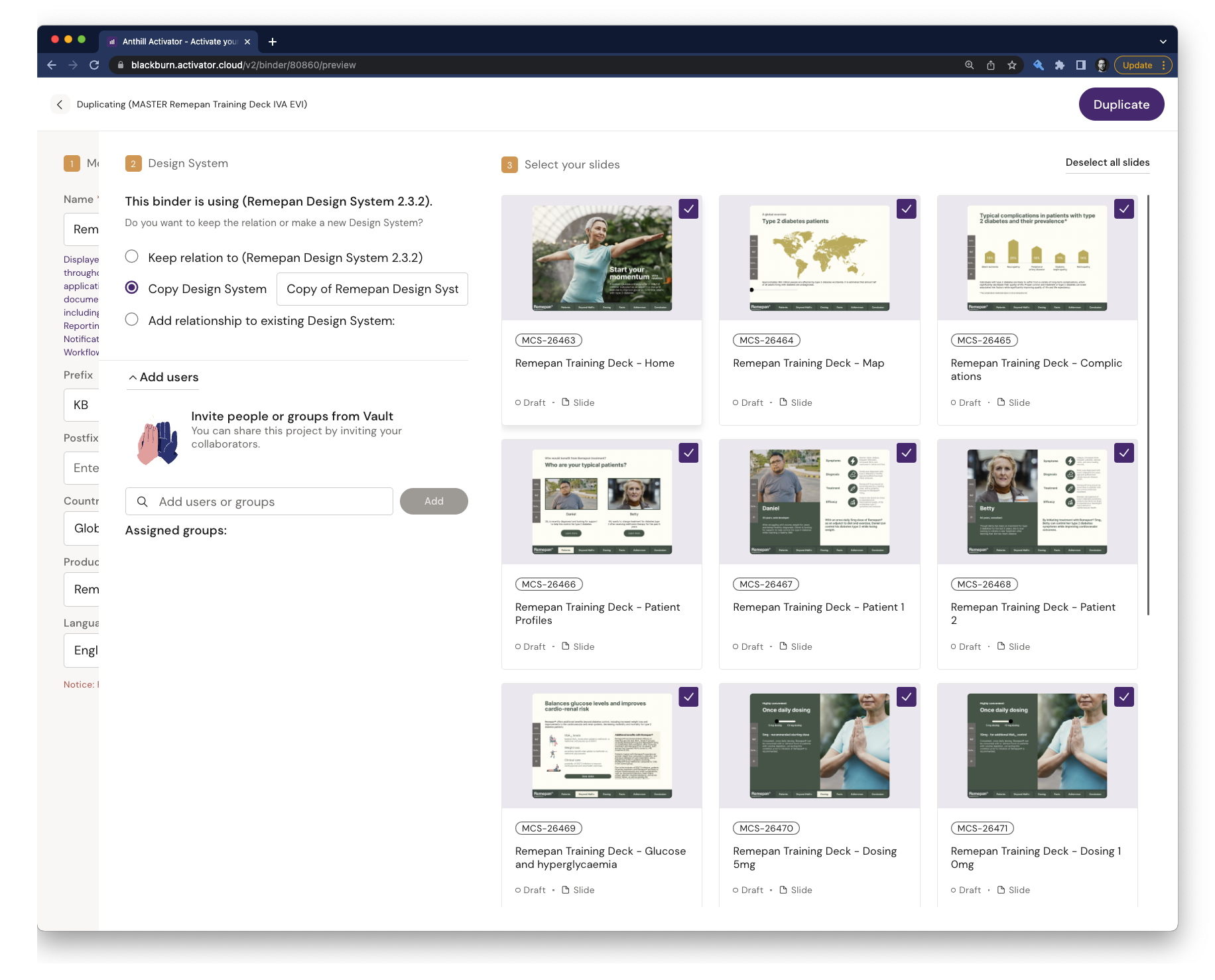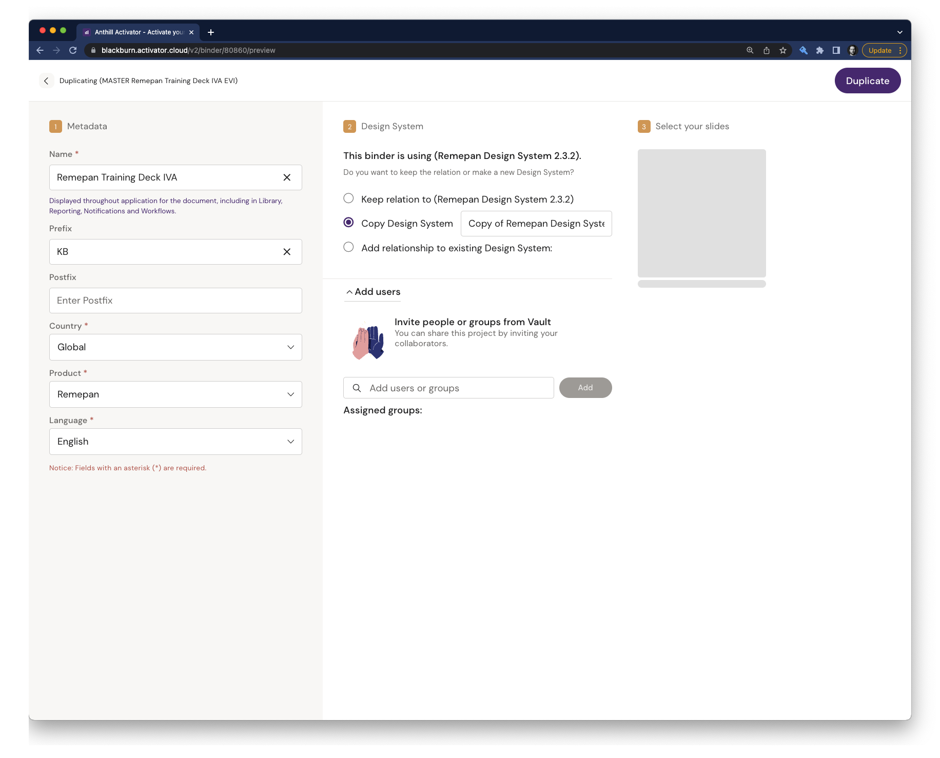 Choose which Clies you would like to copy during the duplication of the Binder - you can use the “Select all slides” to bulk (de)select all.