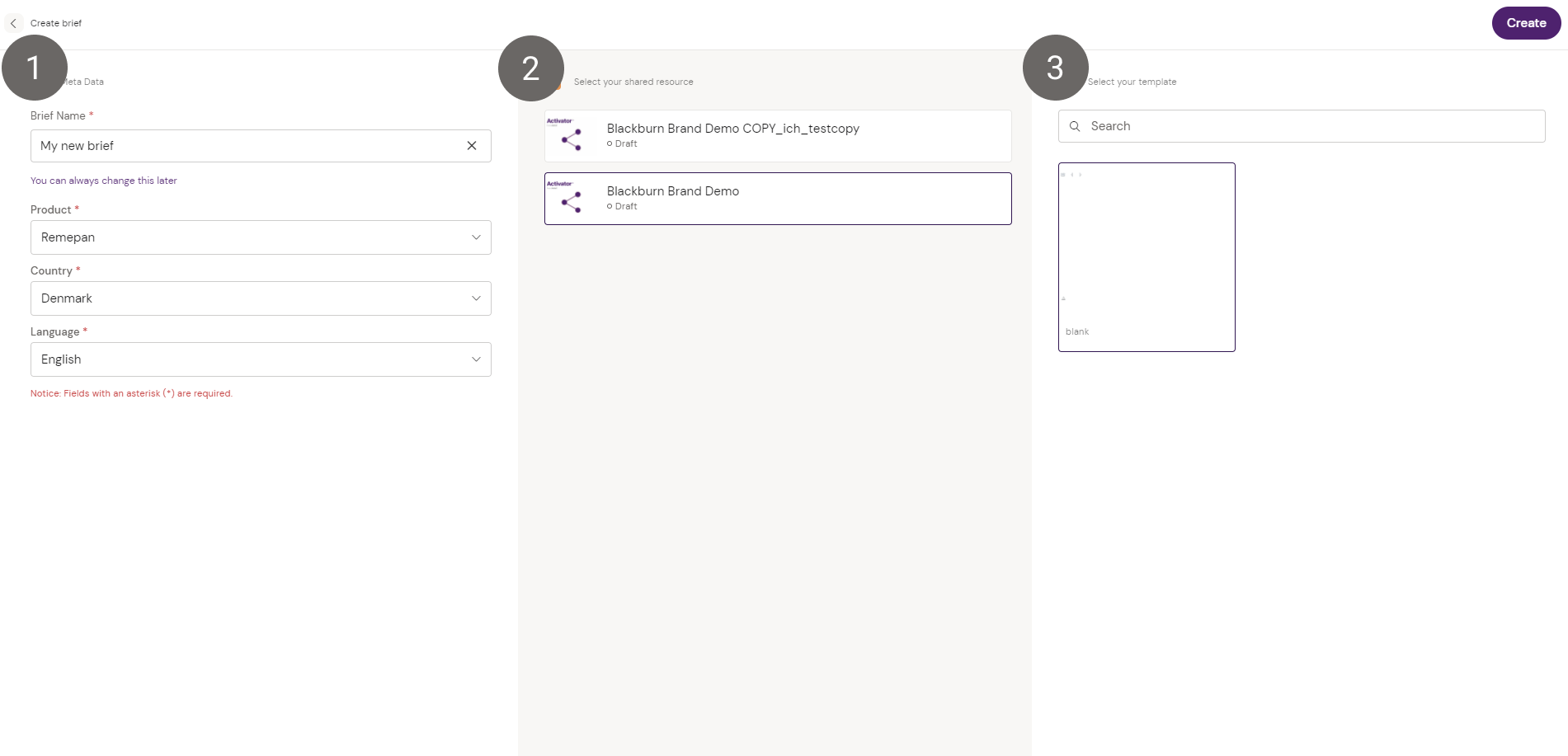 The process of creating a Brief is much similar to that of creating a Binder. A wizard will open which requires that you put in metadata and make choices around the Shared Resource relationship and Template for your Brief.