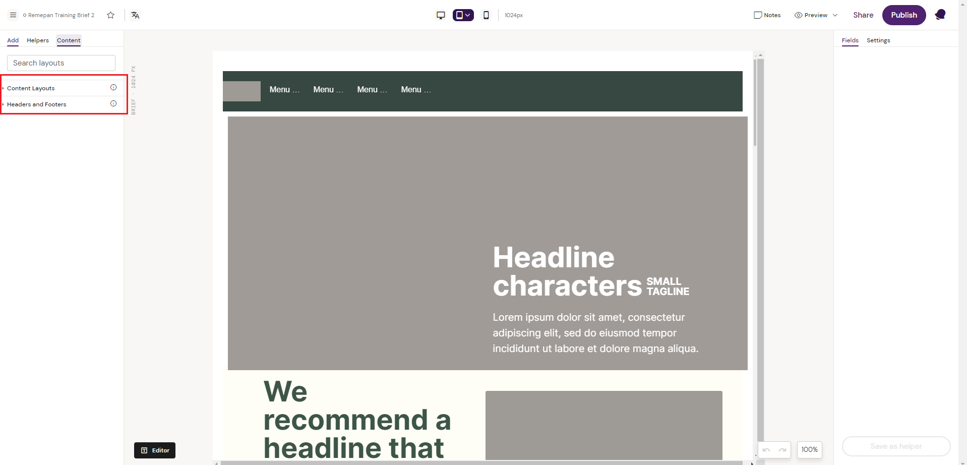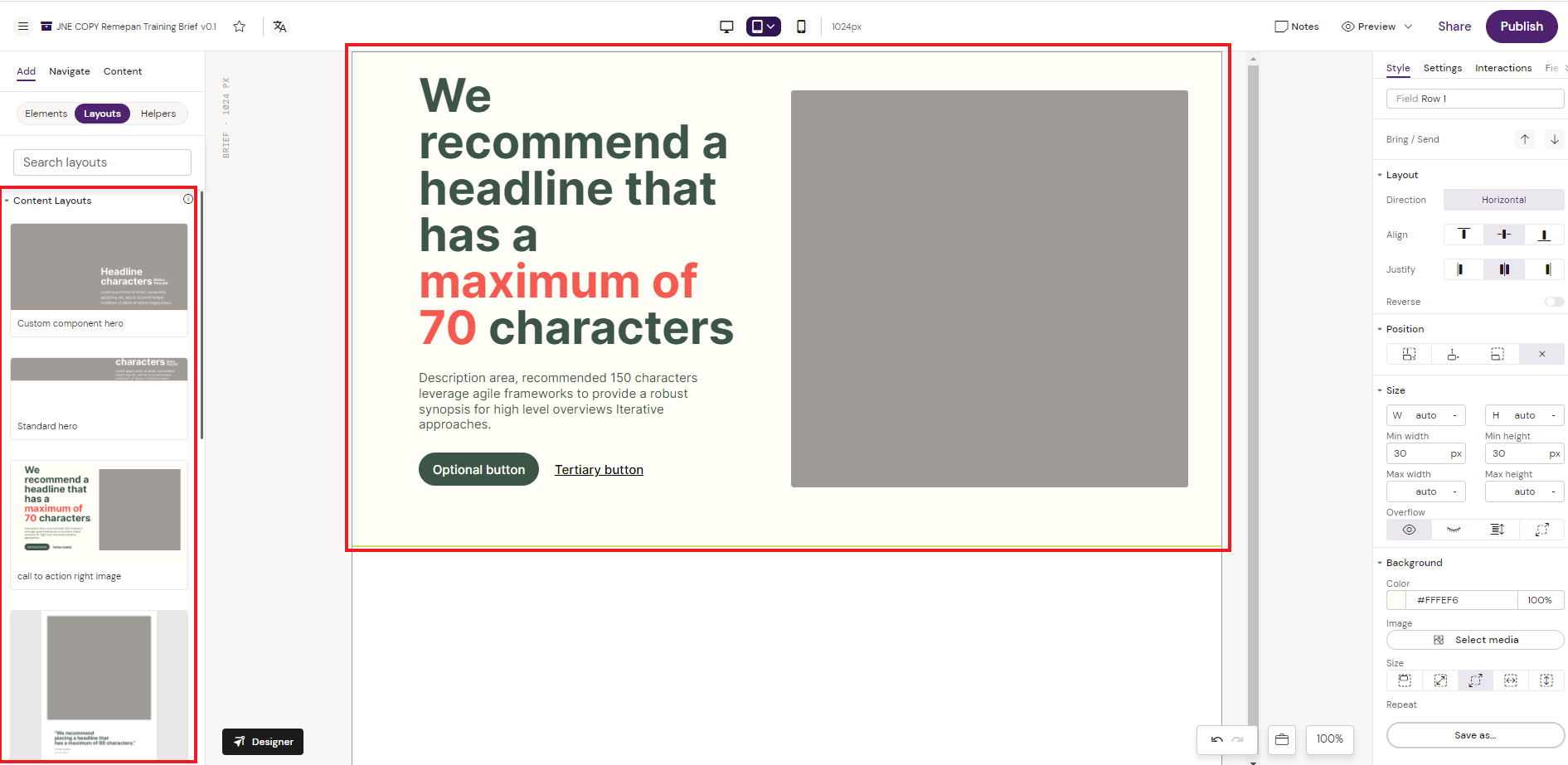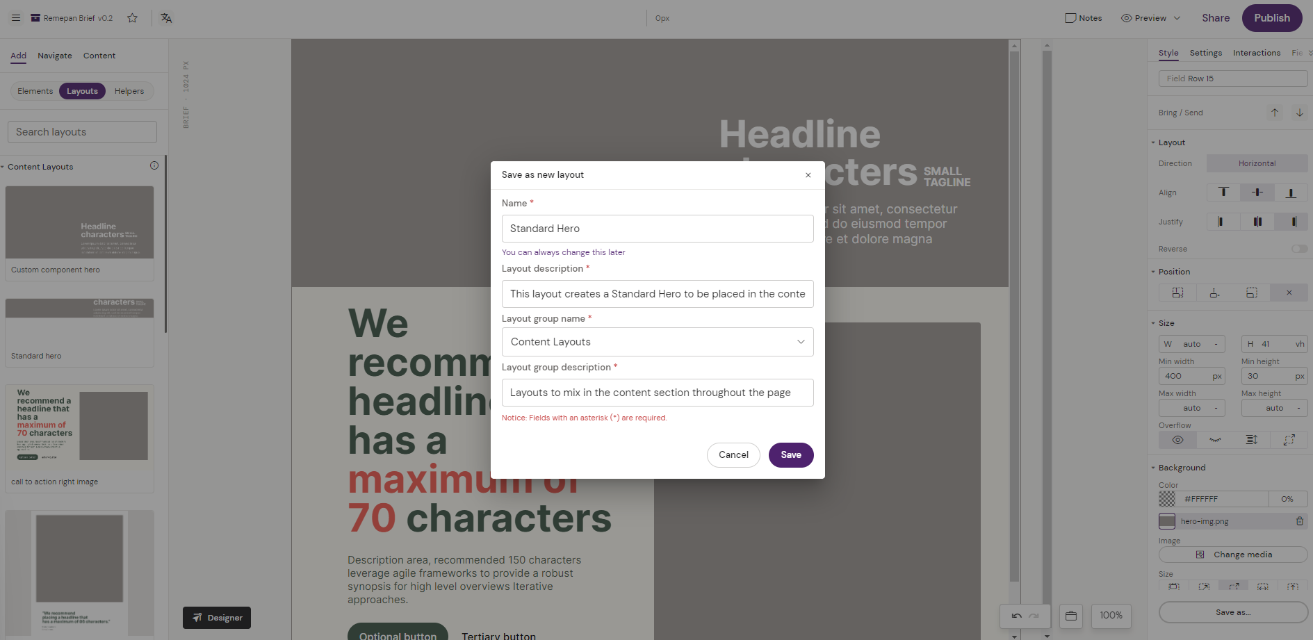 In the below example, we are assembling a Hero Layout that should go into the available Content Layouts for Briefs in the Design System.