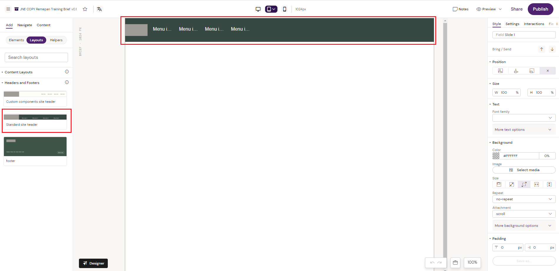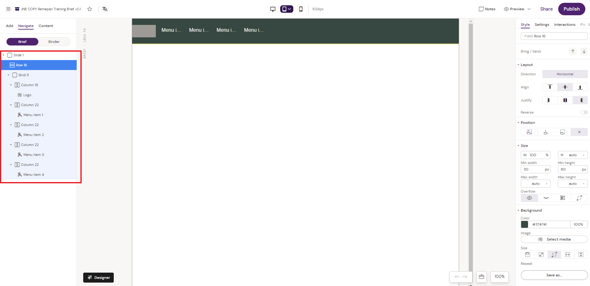 From the “navigate” tab the element structure of the actual Layout is shown. The Layout has been created from a Row/Grid structure with columns placed inside the grid to add a logo placeholder and 4 menu items.