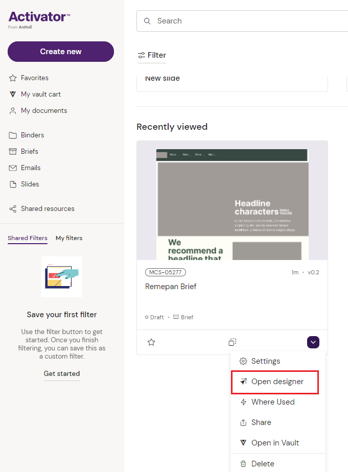 To enter the Designer you can either search for your content from the dashboard and click “Open designer” from the dropdown