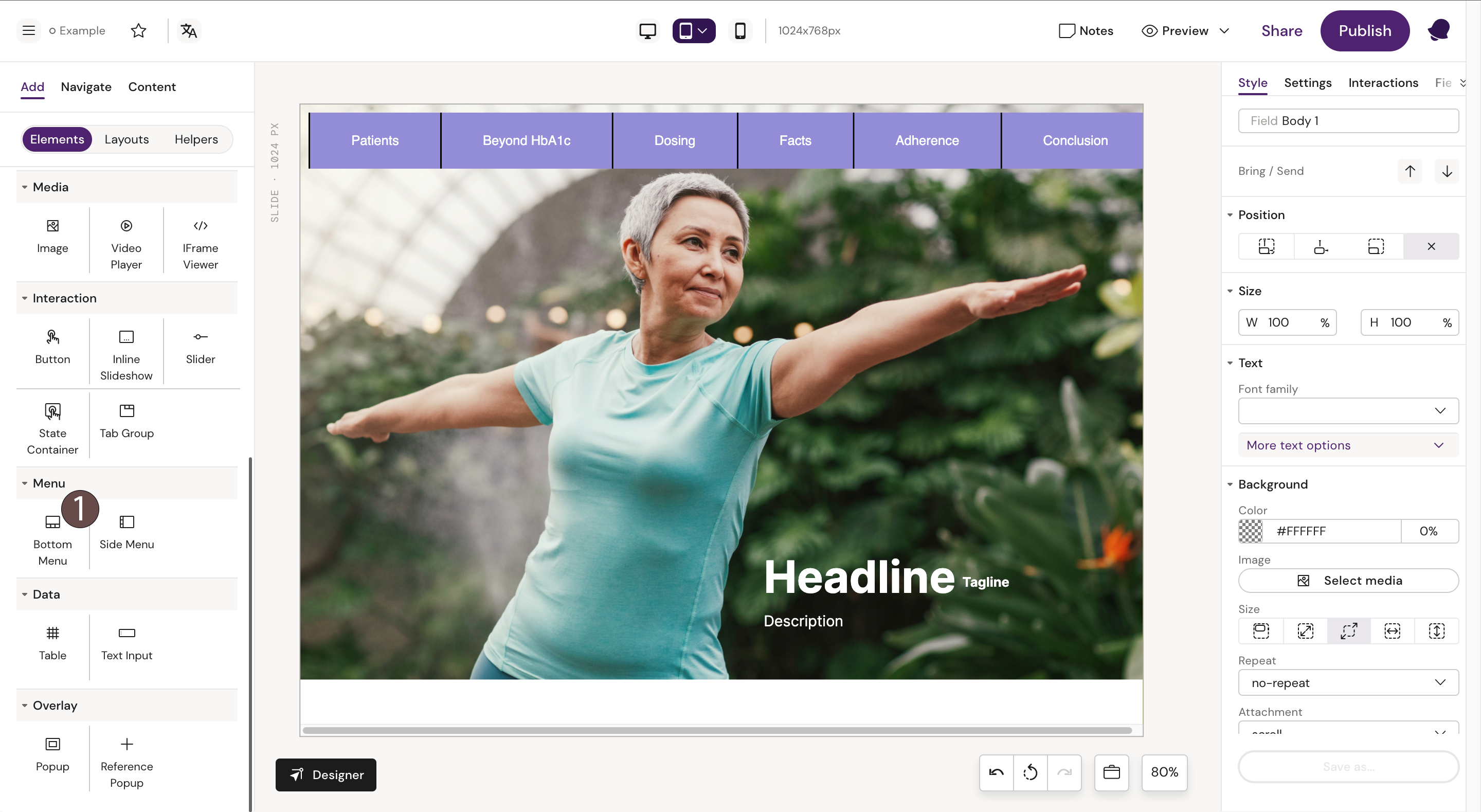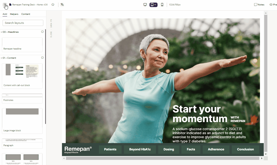 Suppose you localize a presentation and want to use the bottom menu component. In that case, it is important that the binder you place your slides in is created in the Anthill Activator to establish the correct relationship to the Design System.
