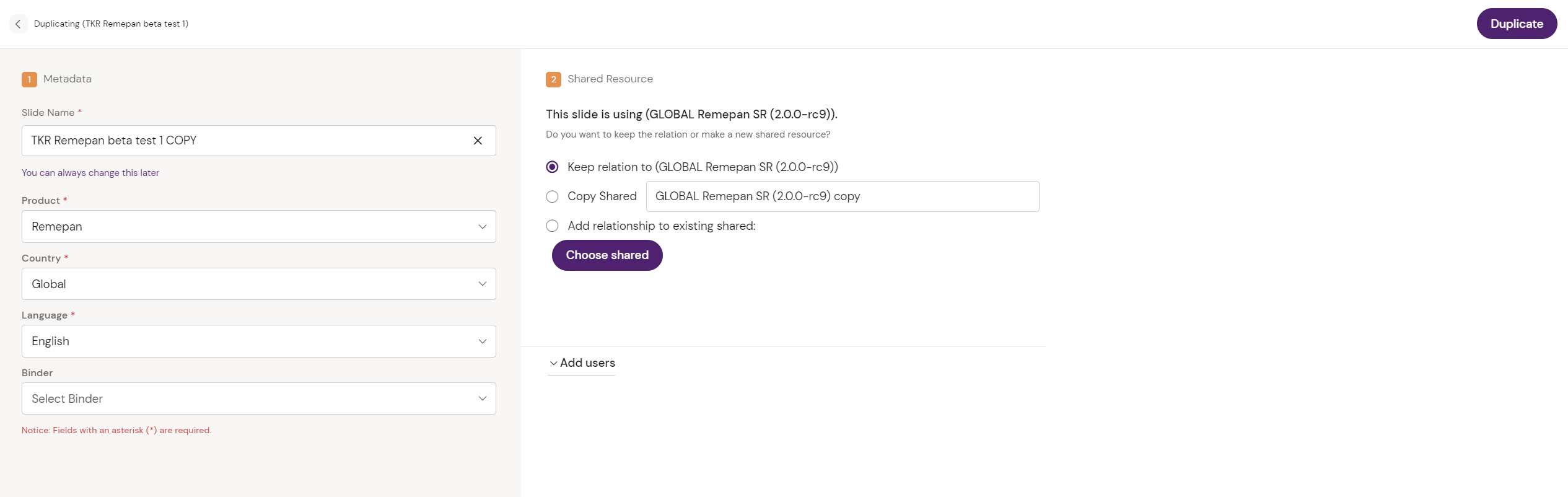 Clicking the button will bring up the aforementioned Duplicate Modal with the same duplication options for Product, Country, Language and Binder, as well as the assigned Design System. Same as before, select ‘Duplicate’ at the very top of the modal to finalize the process.