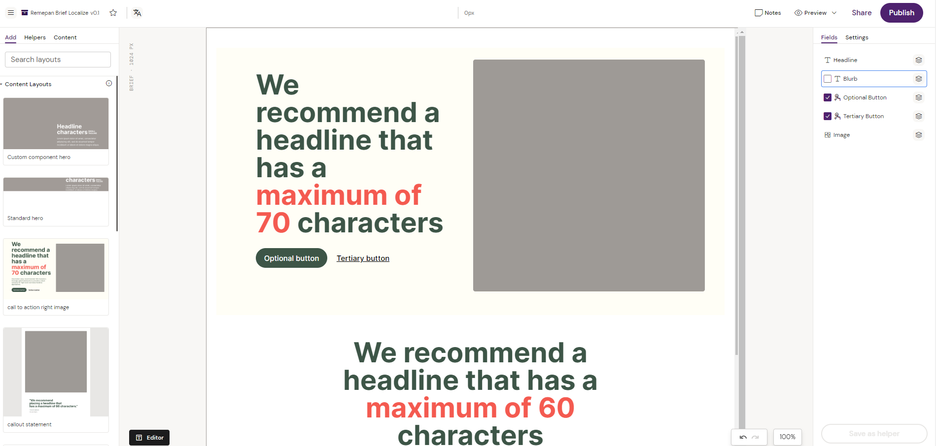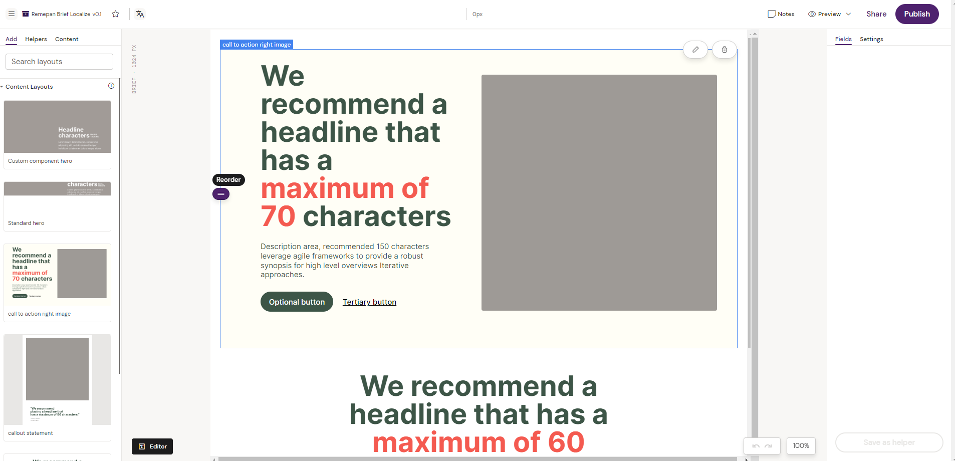 If you do not have any content for your Brief yet, you will need to import the layouts that you want to utilize on your Brief. You can do so from the left hand hand pane under 'Content Layouts'. Just drag and drop the layout of your choosing onto the Brief to start using it.