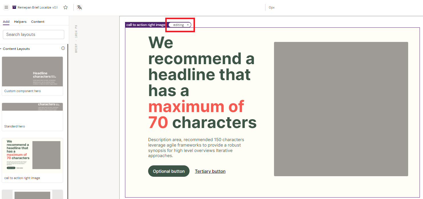 Once your layout has been added to the Brief, you can start editing its contents. Do so by clicking on the layout that you want to edit. This will select the layout and present you with two additional buttons in the top right corner of the layout - one button to edit the layout and one to remove the layout from the Brief.