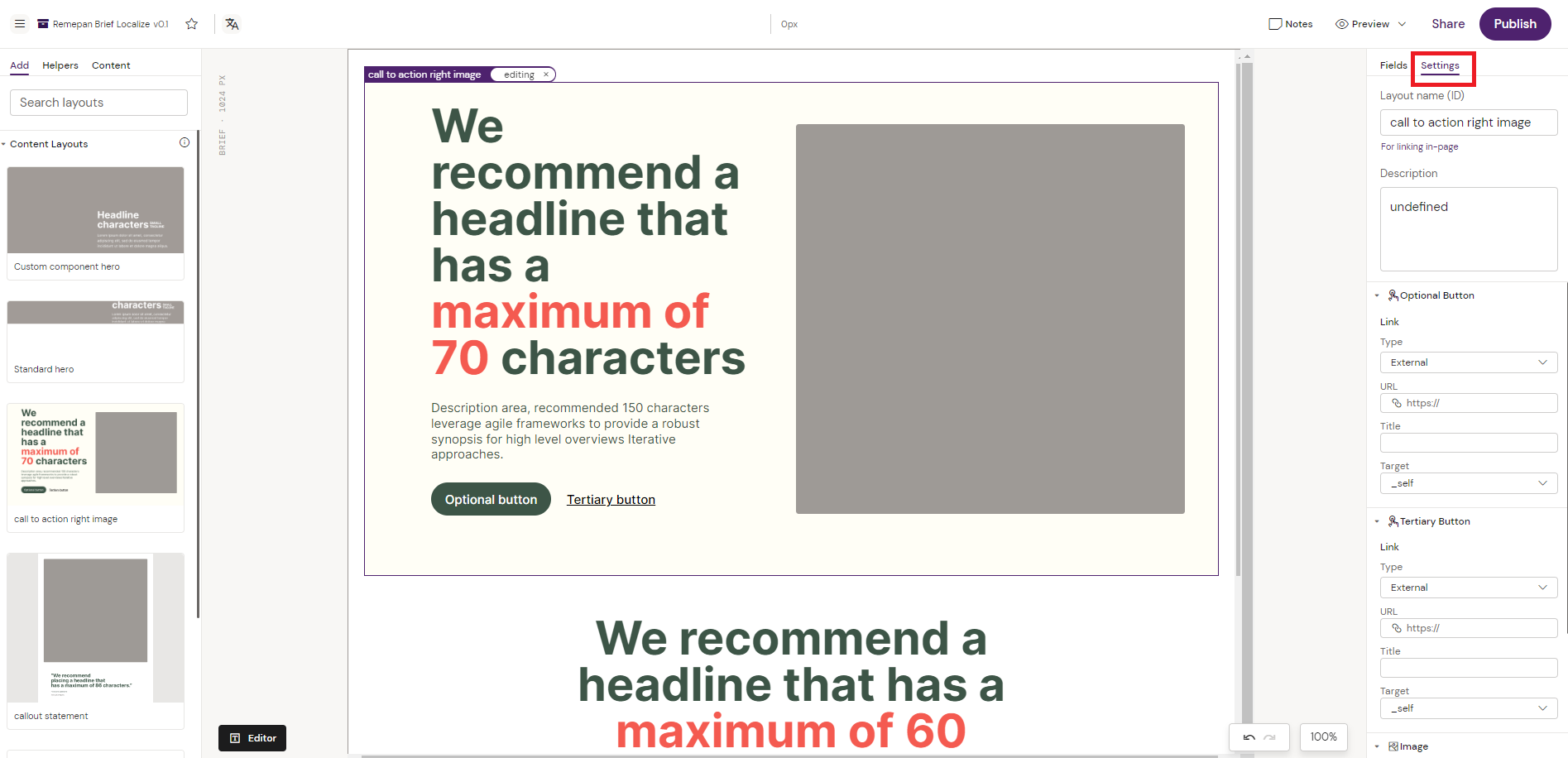 When in the Brief Editor view, select the layout that you want to access settings for by clicking on it. You can access the settings for the layout either by clicking the name of the layout or by navigating to the ‘Settings’ on the right hand pane.