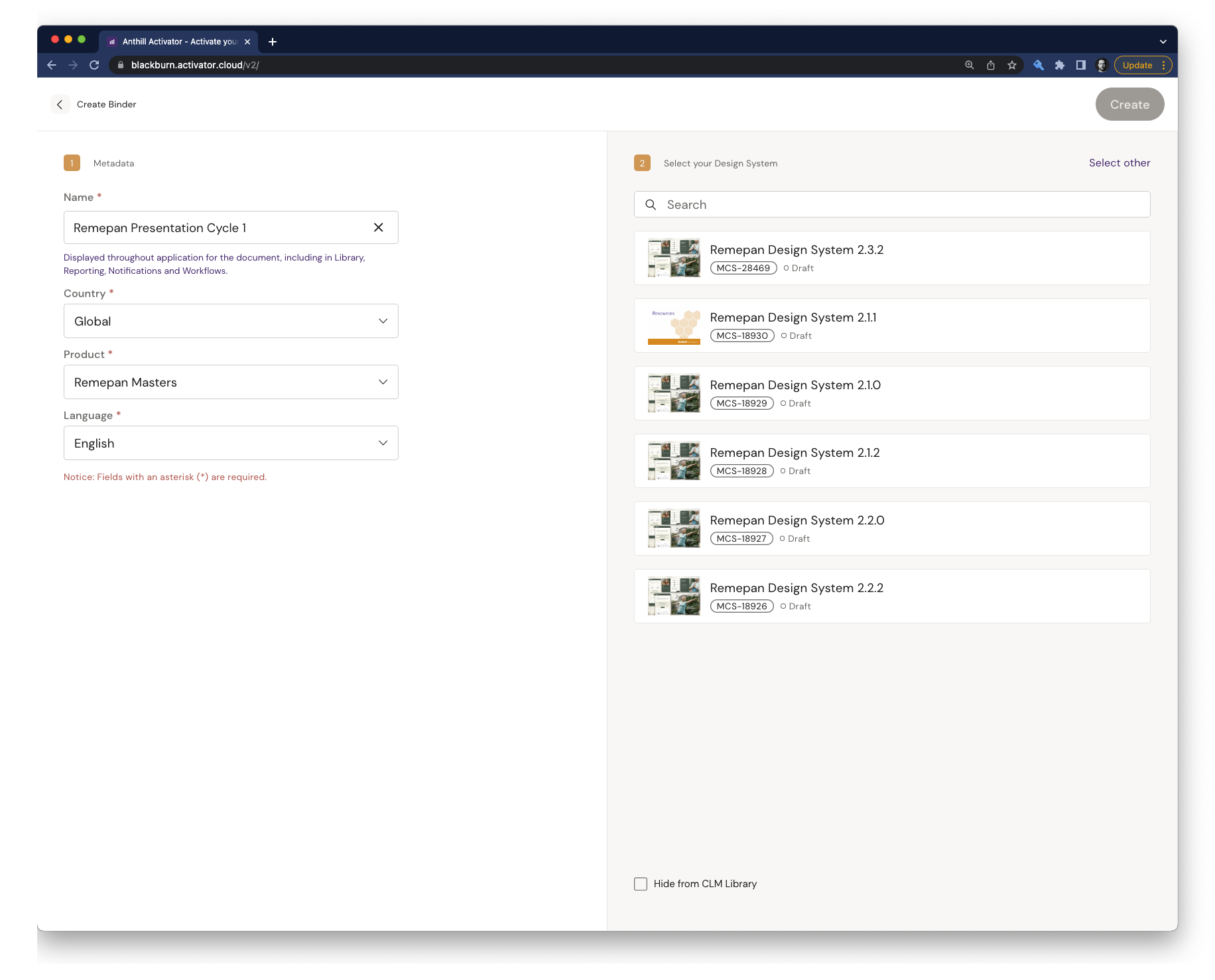 Once you’ve filled out step one, a list of available Design Systems for your Brand & Country will be listed. Select the Design System suitable for your Presentation. When you've selected the Design System hit Create to create the Binder.