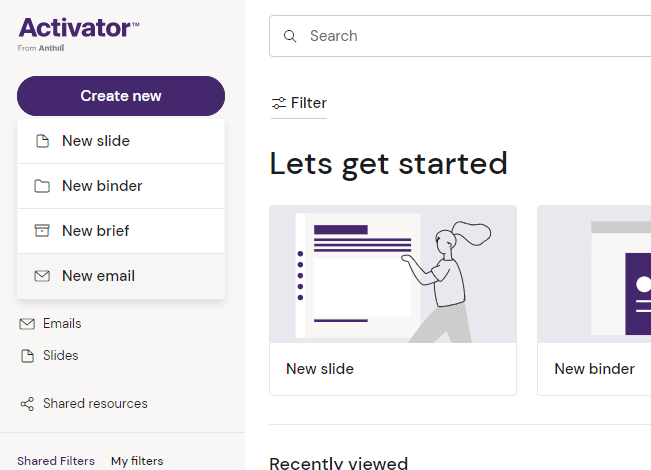 From the main dashboard view, you can click “Create new” and then select “New email” from the dropdown