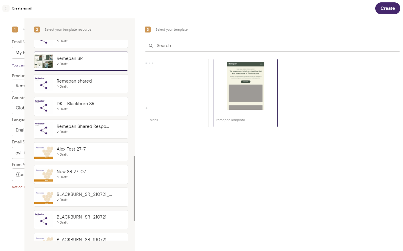 A Template is a predefined design for an Email suitable for your Brand. The Template can include a predefined set of layouts or suggested content. Once you have selected the Template you want to use, the “Create” button will turn purple and can be clicked to create your email.