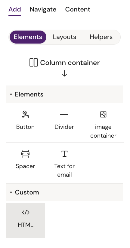 Add an HTML element to the email. It should be draggable for email element reordering.