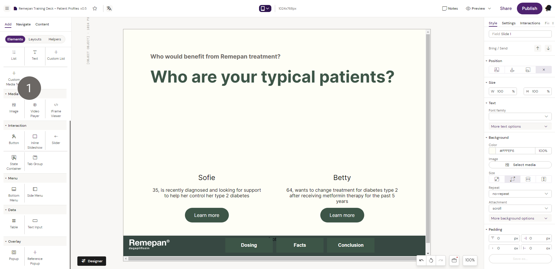 2. Style the image containers accordingly by changing the position and size settings and press “Select media” to add the pictures. Note that the pictures are intended to be changed by an editor for different localizations and versions.