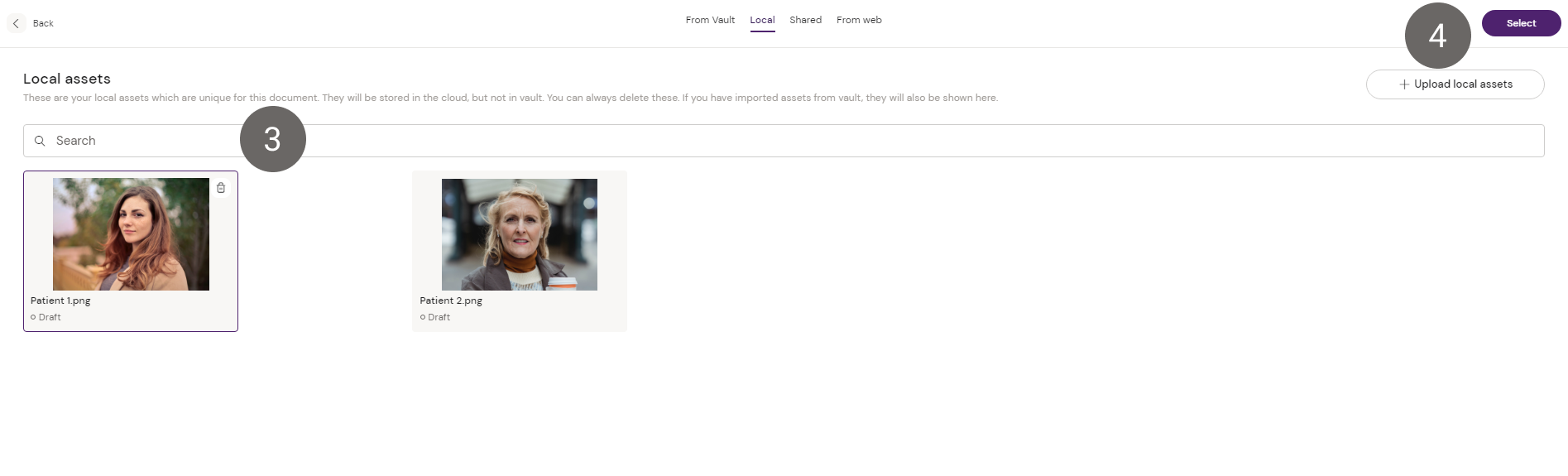 3. Pick the pictures from the media library. Note that you are able to upload pictures from your local computer by clicking “Upload local assets”