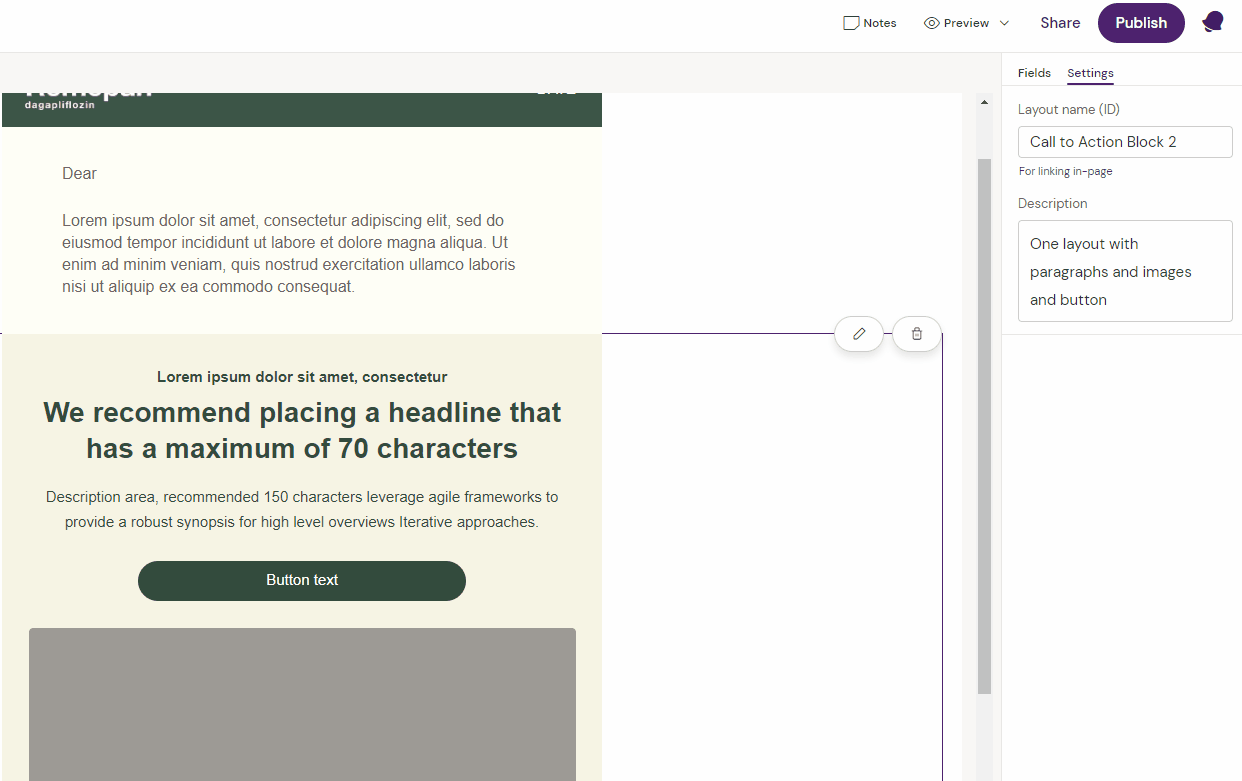 Select the Layout which contains the button and go to edit mode. Select the button, click the settings icon and type in an address or document token in the URL field in the right-side menu. This can either be a website or a direct link to a document stored in Veeva PromoMats.