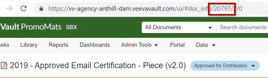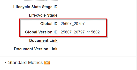 You can find the document ID as part of the URL of the materials once you have selected it as shown below or as part of the Global ID or Global Version ID.