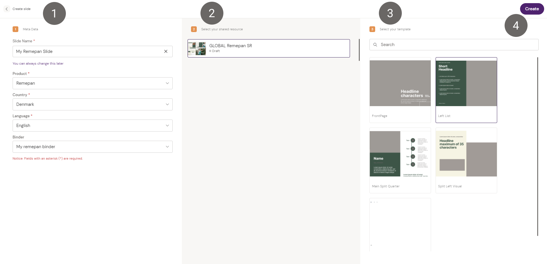 Step 1: Slide name, Product, Country and Language are mandatory. These also determine which shared resources will be selectable in step 2.