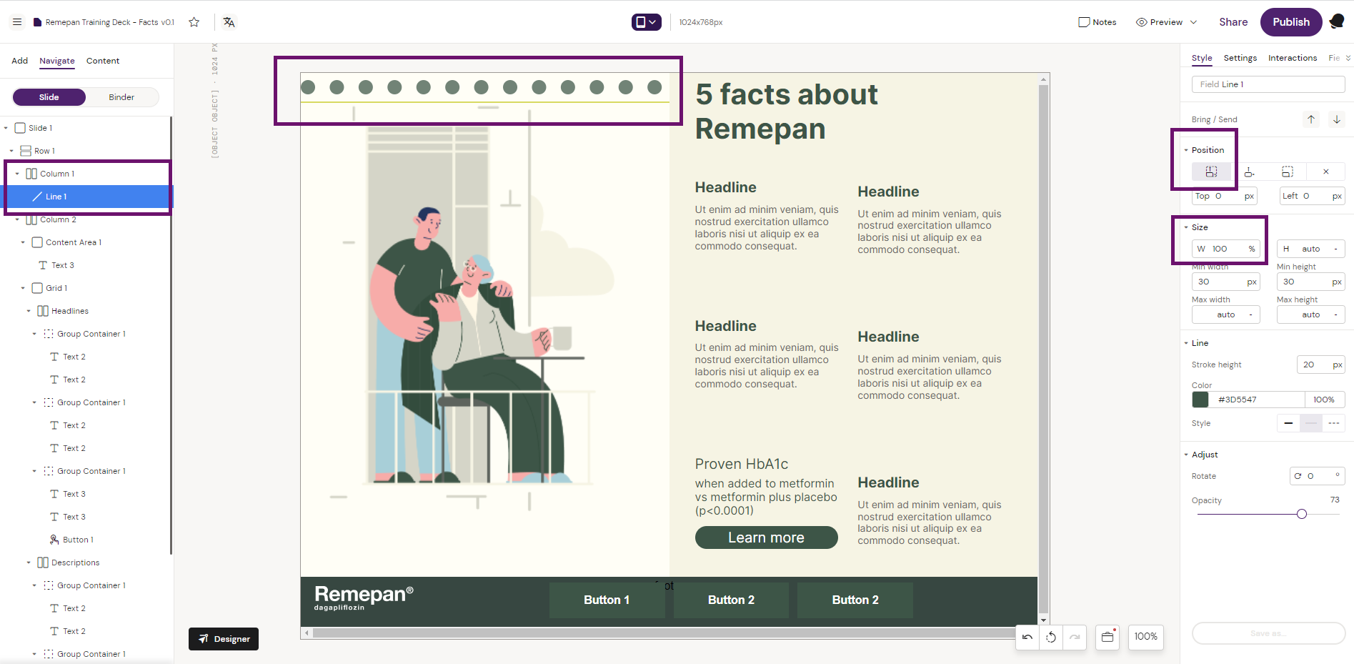 Configure the Line component as required. In the below example, the Line component is configured to be a dotted line in the top left column be applying the Line component as per