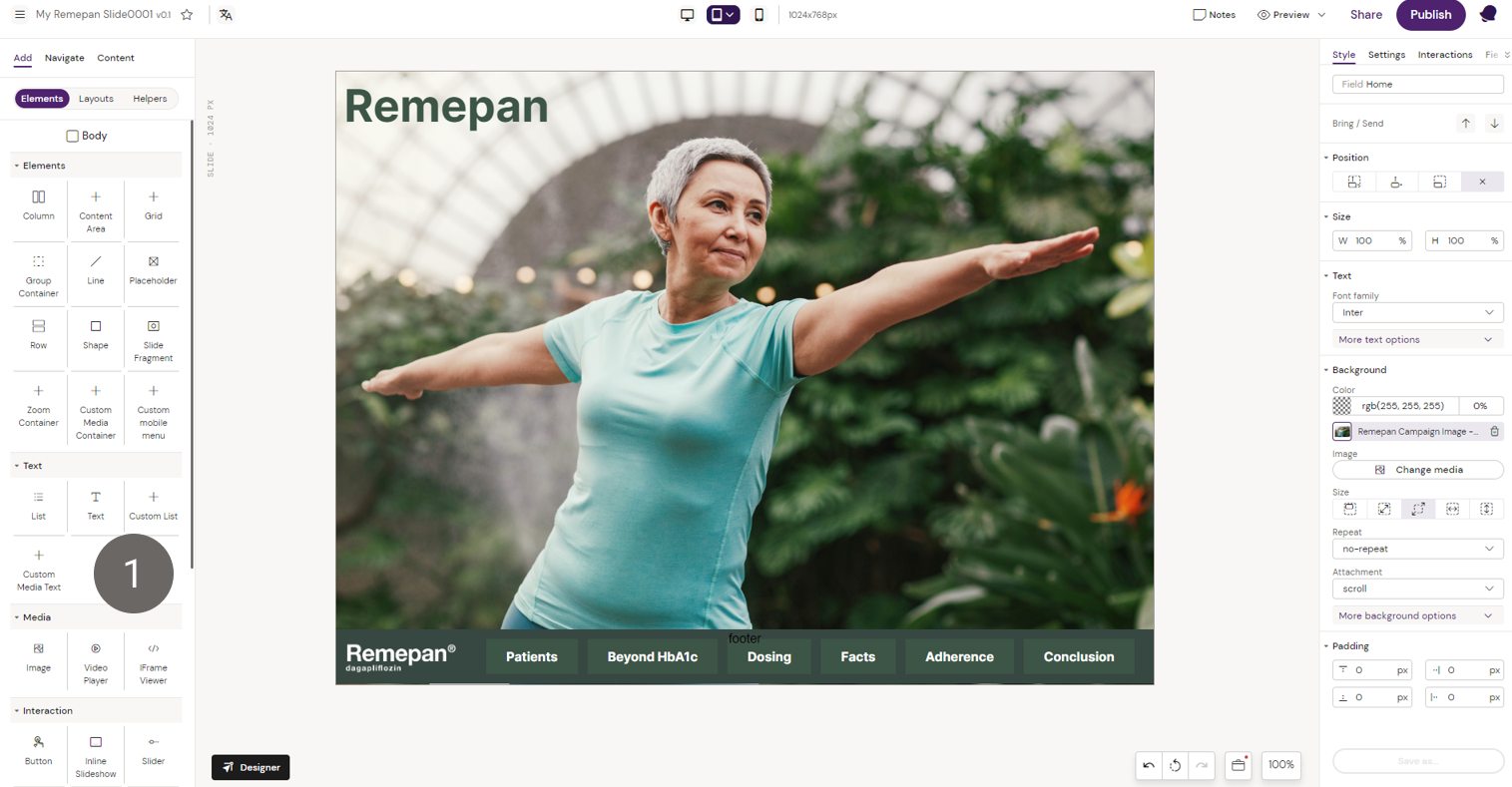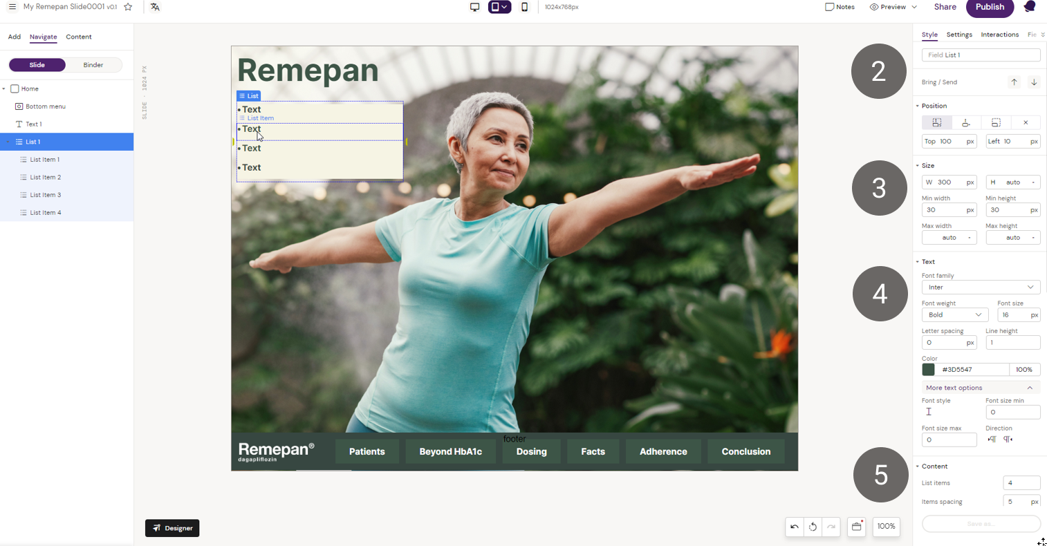 2. Position the List component as required. In this example, the List component has an “Absolute” position and the “Top” position is configured to align the List with the Remepan logo