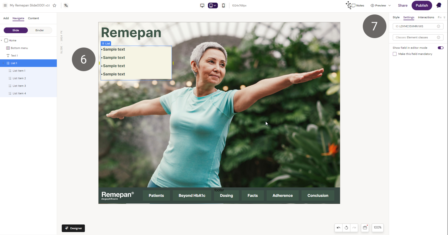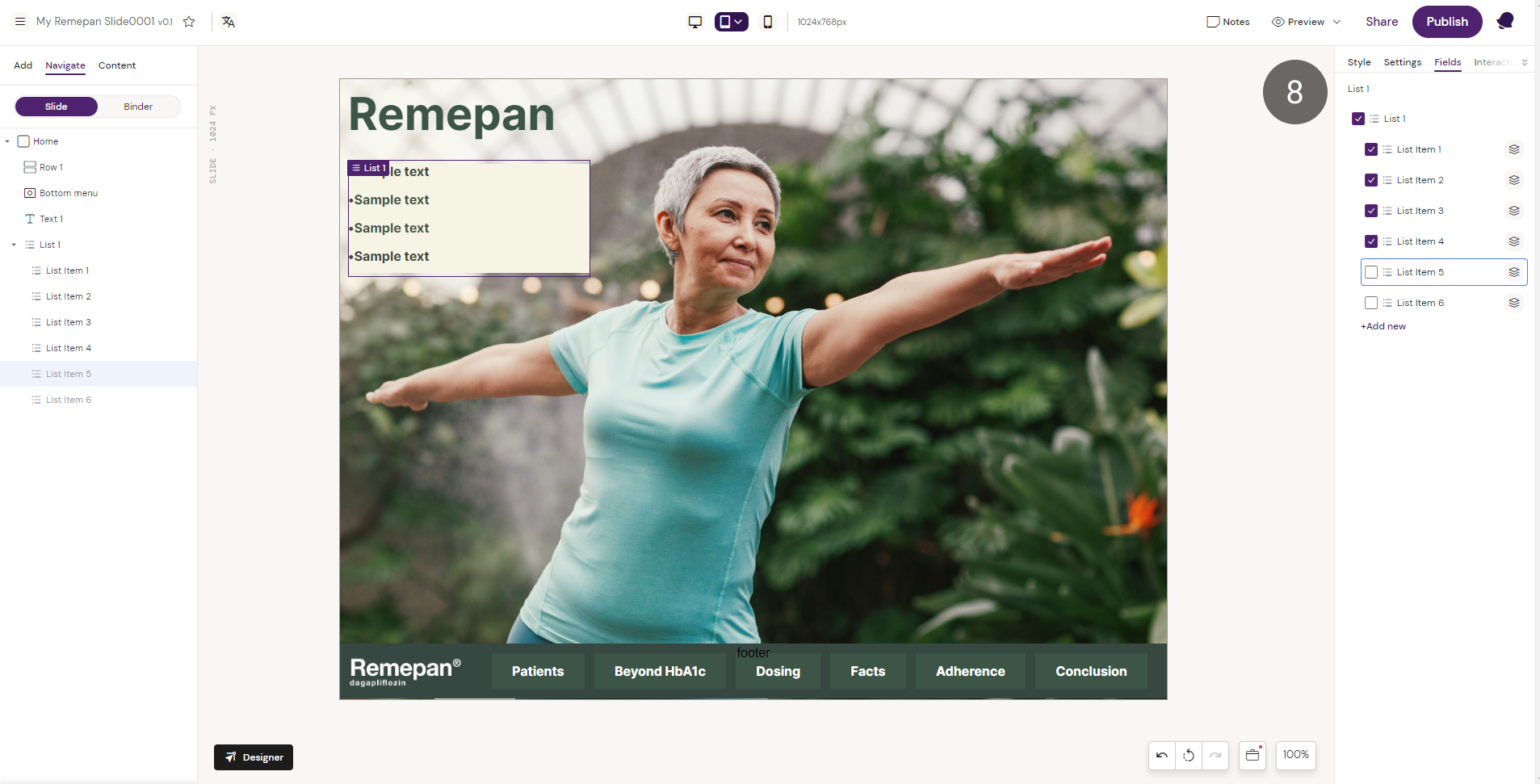 8. Once you’ve added a List component to your Layout in Slide, or Brief, you can add or hide a List Item from Fields in the Right side panel.