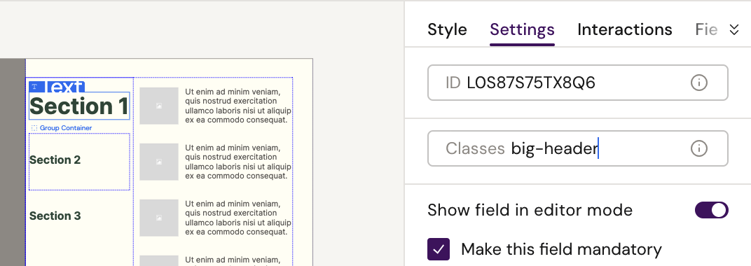 Once you have setup the classes you need (don’t forget to add the file to src/main.css if needed) it’s simple to apply them to text elements in the Activator UI via the settings menu: