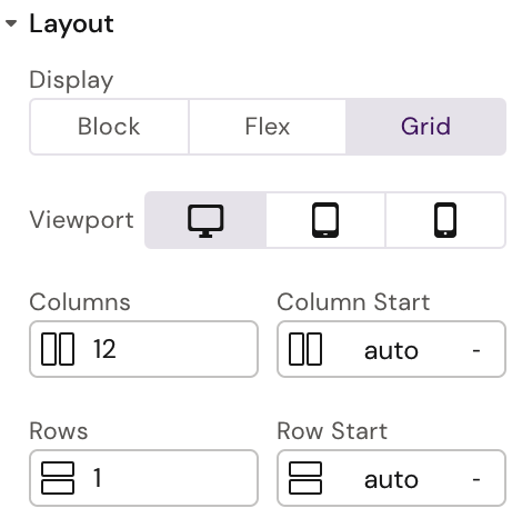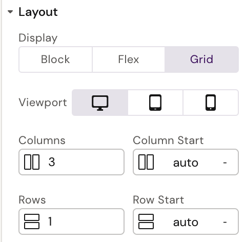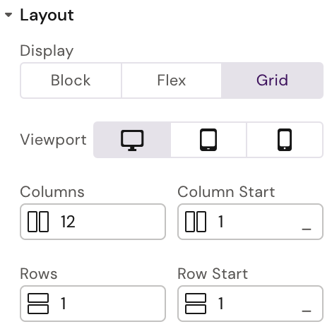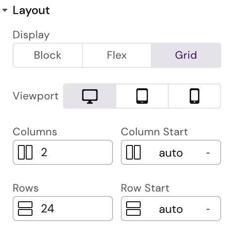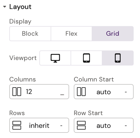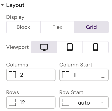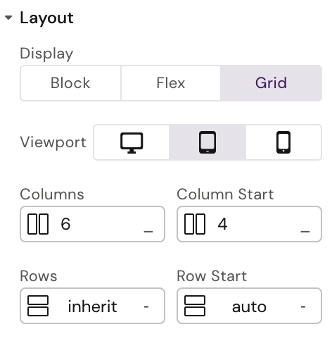 As seen in the above example, it’s possible to configure each column per breakpoint (desktop, tablet and mobile). Both the span of the column/row and at what position it should start can be set.