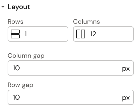 Normally the grid component will act as a simple wrapper to the columns. It is however possible to configure columns and rows of the grid, and the gap between each: