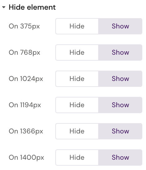 Clicking ‘Hide’ will hide the element at that resolution and below, until next breakboint. E.g. selecting ‘Hide’ at 1024px will means the element is hidden between 769px and 1024px.