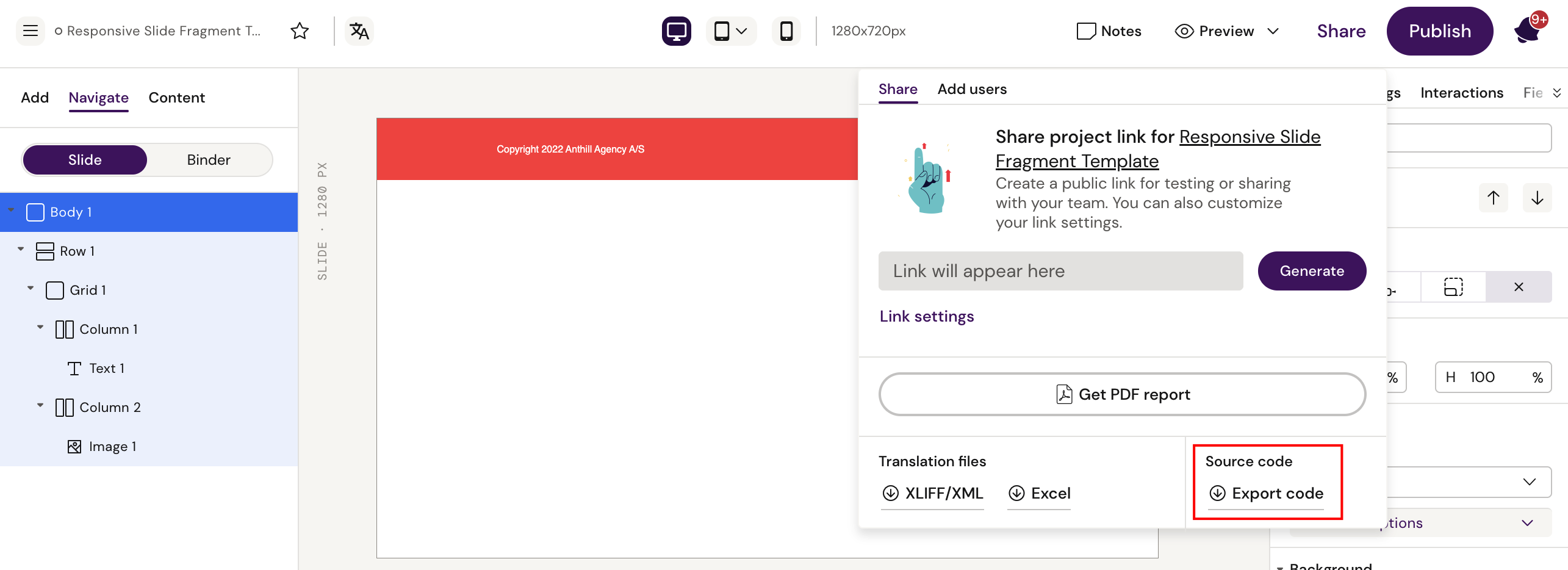 One design is ready, click the ‘Share’ button in top menu and then ‘Export code’ as shown: