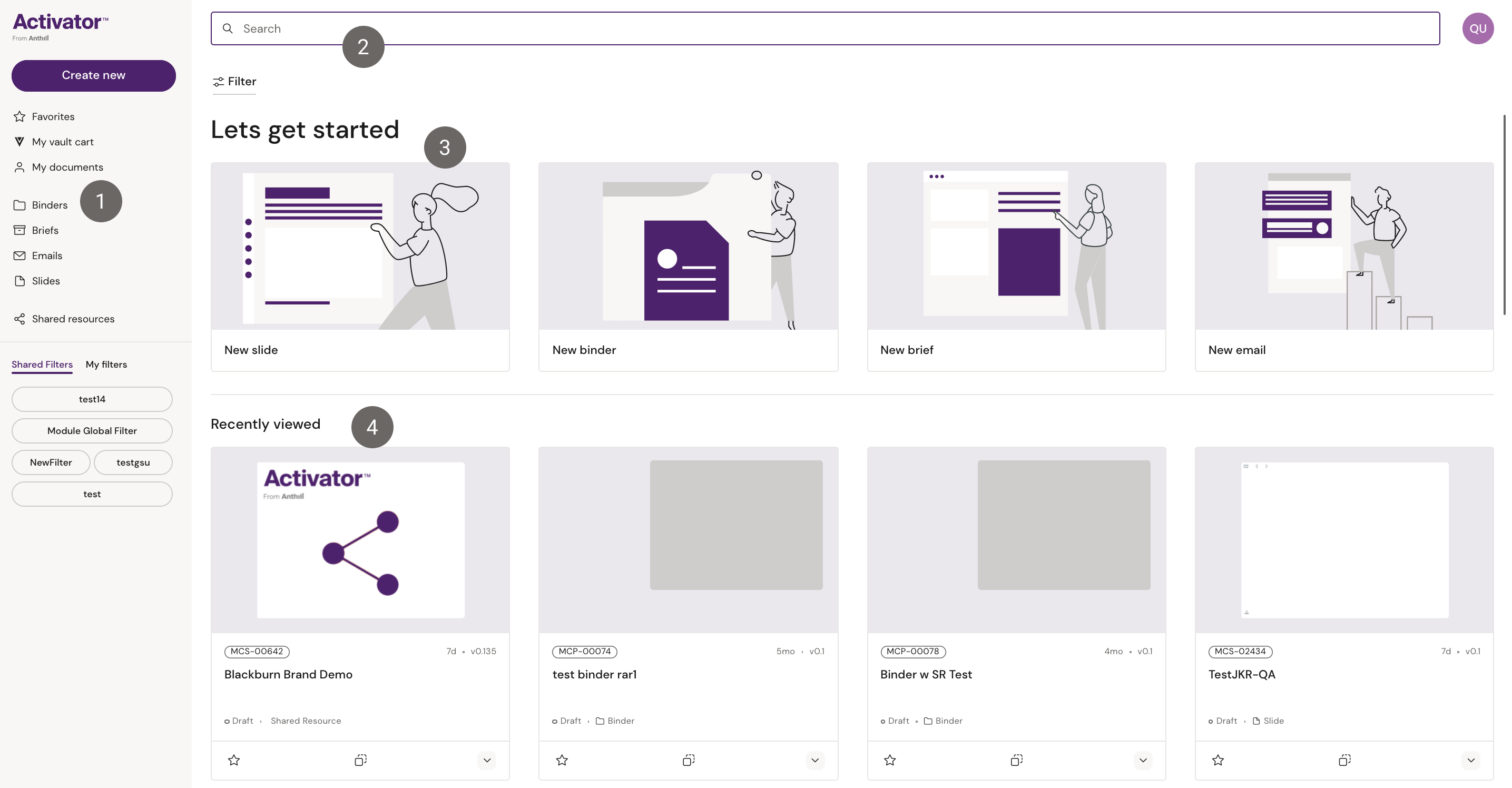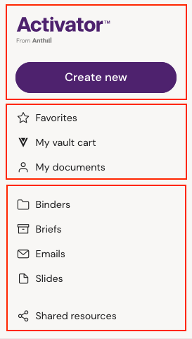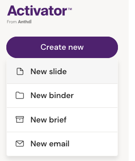 Users can also create a new document by clicking the ‘create new’ button in the left panel of the Activator dashboard. A drop down will appear with the option to choose between creating a new slide, binder, e-mail, or brief.