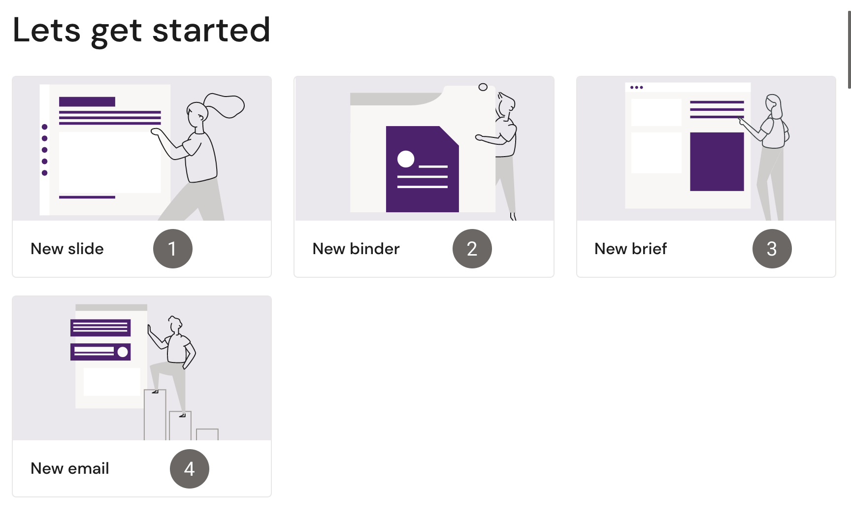 In this section, the four displayed cards give you the option to create different documents.
