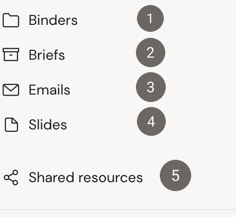 Click the ‘create new’ button to create new content. A dropdown opens and you have the option to create a new binder, slide, brief or E-Mail. Click on one of the options to create a new document. If you want to learn more about creating new content, check here.