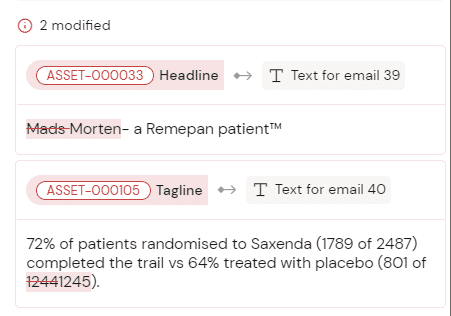 Content linked to Veeva Vault Modular Content which already is approved through an MLR review.Unlinked (purple color)