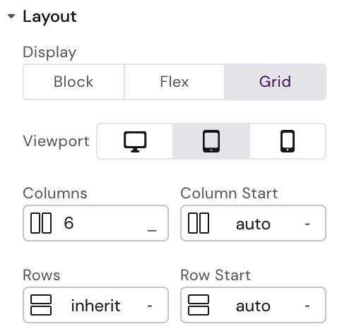 As seen in the above example, it’s possible to configure each column per breakpoint (desktop, tablet and mobile). Both the span of the column/row and at what position it should start can be set.